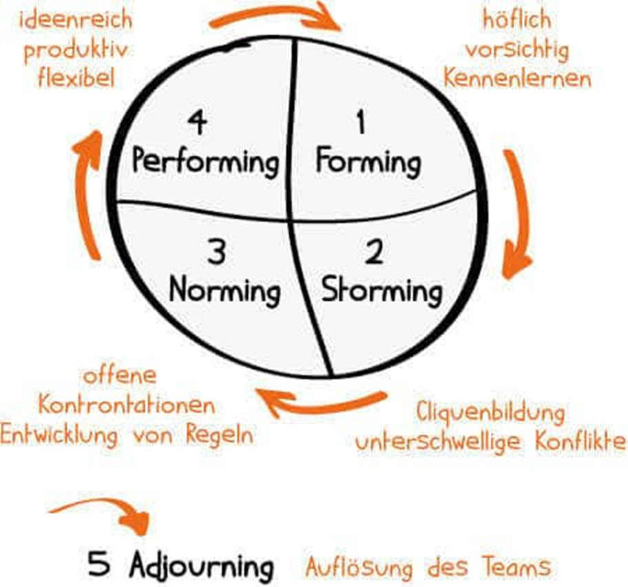 - Tuckman-Modell (nach A. Lackner): Das Modell beschreibt, wie Teams sich entwickeln. Das Modell hilft zu verstehen, warum Gruppen oft zuerst durch schwierige Phasen gehen müssen, bevor sie richtig gut funktionieren. Es gibt vier Phasen: